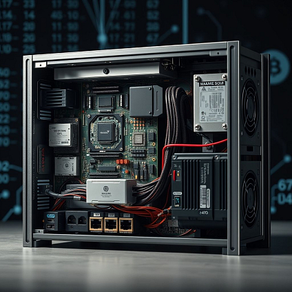 Майнеры часто имеют встроенные сетевые интерфейсы (Ethernet) для подключения к интернету и USB порты для обновления прошивки или подключения к другим устройствам. Все компоненты заключены в прочный корпус, который защищает их от внешних воздействий.